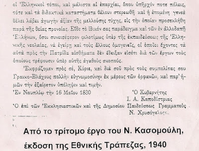 Όπως προκύπτει από το τρίτομο έργο του Ν. Κασομούλη (έκδοση της Εθνικής Τράπεζας, σελίδα 59, το 1940), ο Καποδίστριας έστειλε, υπό ημερομηνίαν 16 Μαϊου 1830, ευχαριστήρια επιστολή προς τον Σίμωνα Γ. Σίνα, η οποία έχει ως εξής: