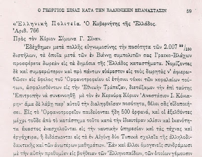 Από την ευχαριστήρια αυτή επιστολή του κυβερνήτη Ιωάννη Καποδίστρια προς τον Σίμωνα Γ. Σίναν κρατήσαμε μερικές σημειώσεις, που καταφέρουν συντριπτικά χτυπήματα στη γνωστή ανθελληνική (εντός και εκτός των τειχών) προπαγάνδας, που θέλει και επιμένει προκλητικά και ανιστόρητα τους Ελληνόβλαχους … «μειονότητα» στην πανάρχαια ελληνική τους κοιτίδα!