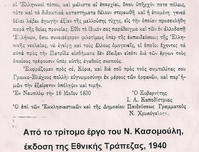 Από την ευχαριστήρια αυτή επιστολή του κυβερνήτη Ιωάννη Καποδίστρια προς τον Σίμωνα Γ. Σίναν κρατήσαμε μερικές σημειώσεις, που καταφέρουν συντριπτικά χτυπήματα στη γνωστή ανθελληνική (εντός και εκτός των τειχών) προπαγάνδας, που θέλει και επιμένει προκλητικά και ανιστόρητα τους Ελληνόβλαχους … «μειονότητα» στην πανάρχαια ελληνική τους κοιτίδα!