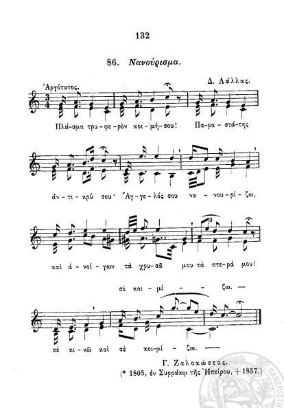 Στο έργο του Αναστασίου Μάλτου ''Τερψιχόρη Ήτοι συλλογή χορικών ασμάτων'', στις σελ. 126-132, συμπεριλαμβάνονται οι πρώτες συνθέσεις του Δημητρίου Λάλλα (βλ. Anemi). Στην τελευταία δε σελίδα των συνθέσεων του, έχει επιλέξει το ''Νανούρισμα'' του μεγάλου ποιητή και αγωνιστή Γεωργίου Ζαλοκώστα από το Συρράκο της Ηπείρου.