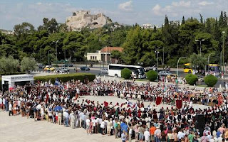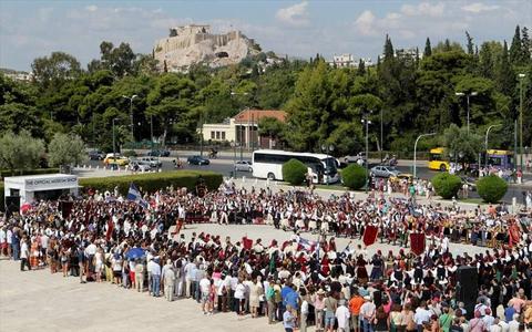 Τα χορευτικά τμήματα της ΠΟΠΣΒ εισήλθαν τιμητικά στο εσωτερικό του αρχαιολογικού χώρου του Καλλιμάρμαρου, όπου καταρχήν φωτογραφήθηκαν και στη συνέχεια παρήλασαν προς τον προαύλιο χώρο του Σταδίου για την τέλεση του «Μεγάλου Χορού».